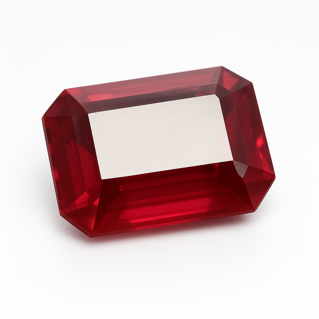 Loose emerald cut Burma ruby on white background, highlighting eye-clean clarity